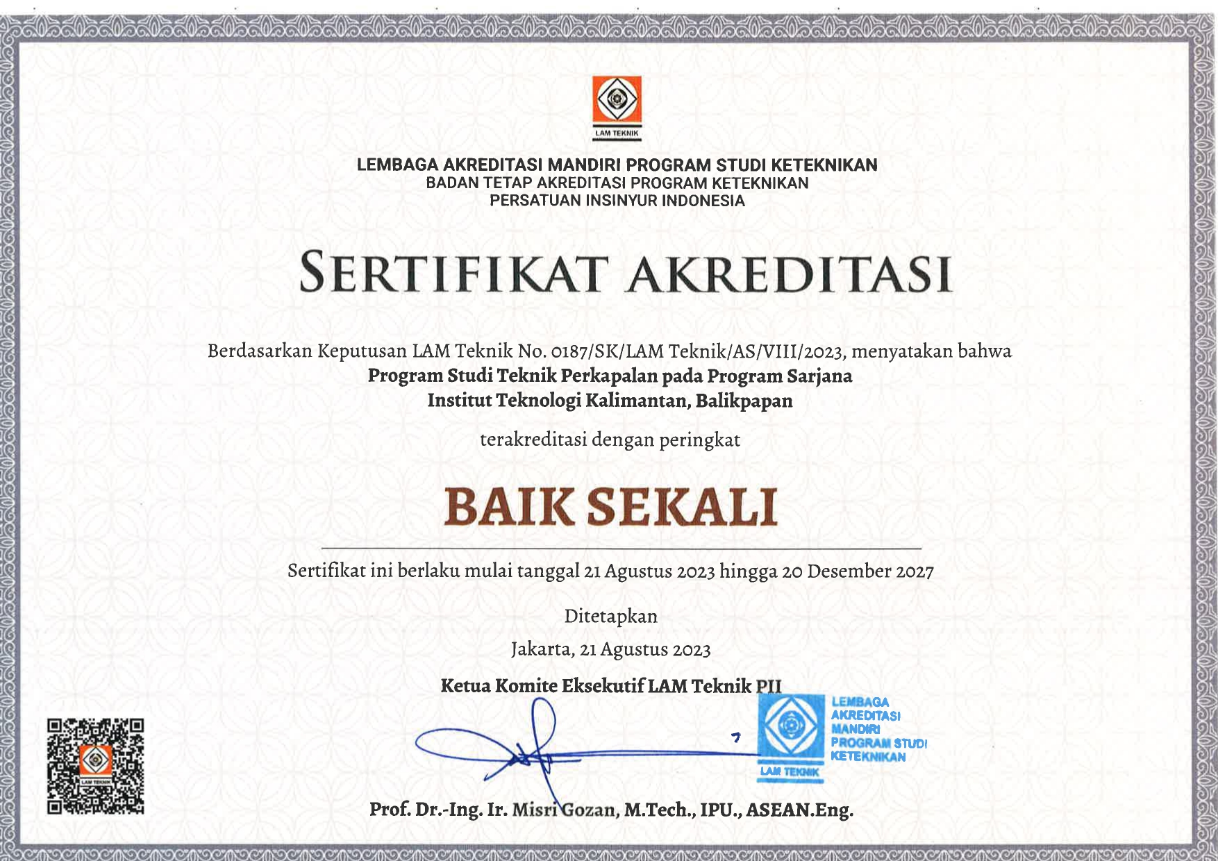 Berdasarkan Keputusan LAM-TEKNIK, No. 0187/SK/LAM Teknik/AS/VIII/2023. Berlaku mulai 21 Agustus 2023 sampai dengan 20 Desember 2027 Terakreditasi dengan peringkat BAIK SEKALI Download File Akreditasi Nasional : https://2cm.es/AkreditasiPerkapalan2023sd2027+